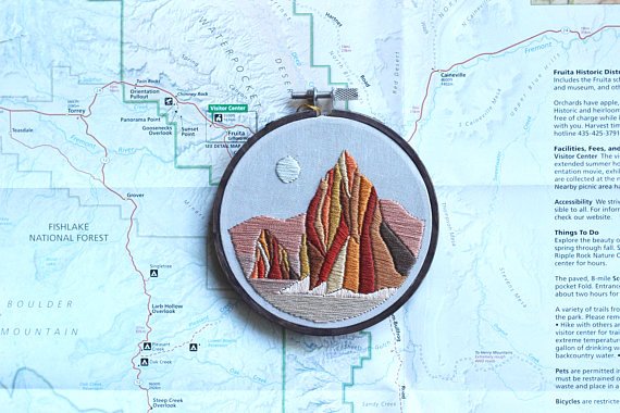 Explore the national parks of the American West with Olive + Thread’s embroideries. Each of owner Rachel Erickson’s hoops frames an iconic element of the rugged landscape of her home state of Utah: canyons, buttes, mesas, hoodoos, cliffs, spires, and arches.