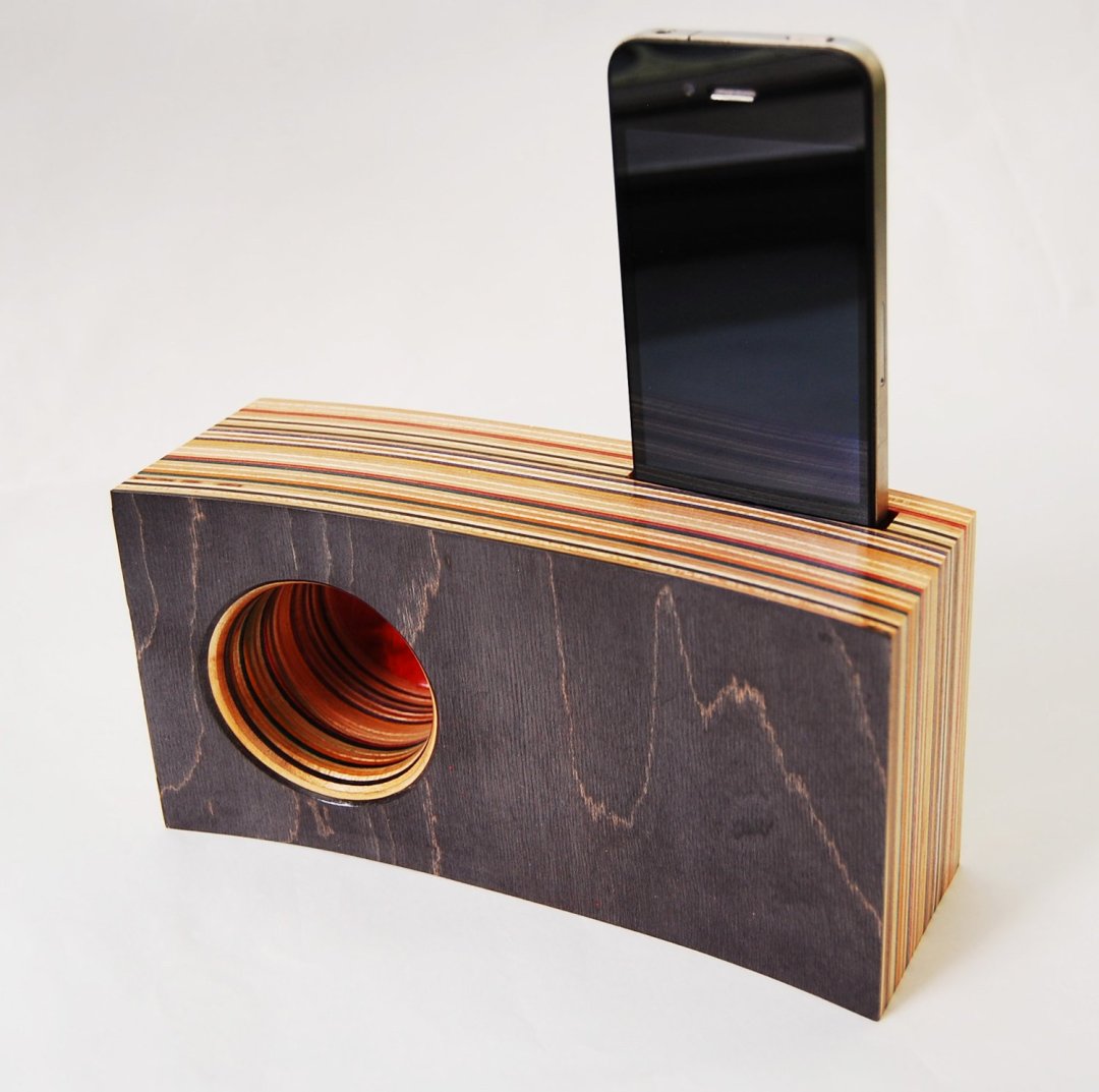 Look, no cords! This sleek acoustic smartphone speaker is entirely handmade from reclaimed skateboard decks.