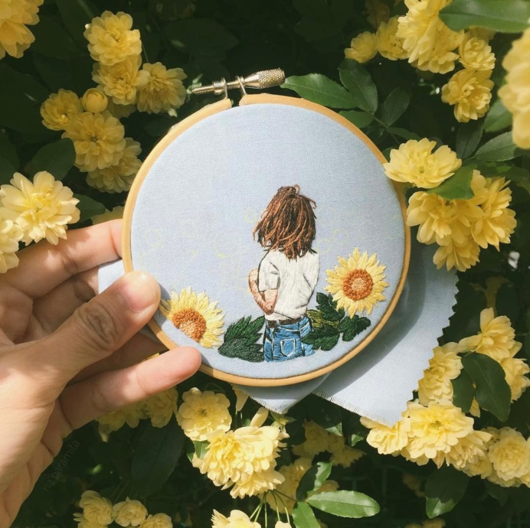 Japan-based portraitist Ria Paramita’s sunflower-adorned embroidery art speaks to the dreamer in all of us—and can be customized to resemble any of us.