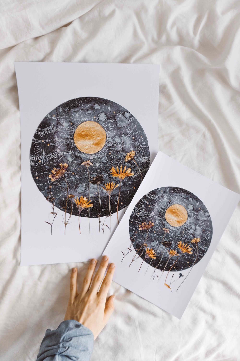 Australian artist and Instagram star Annie Tarasova of Dreamy Moons captures the vastness of our glittering galaxy and the fragile beauty of a patch of wildflowers in a single watercolor print.